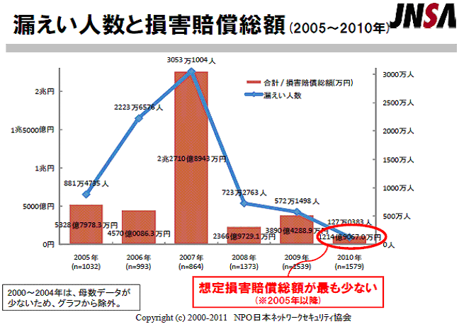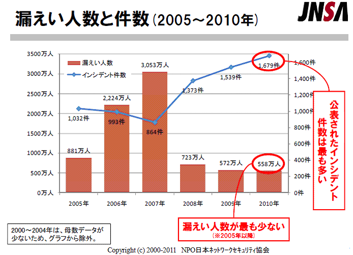 根據日本JNSA(Japan Network Security Association)調查研究部安全受害調查工作團體 2011年6月8日 於JNSA2010年度活動報告會上所提出的2010年關於情報安全意外事件的調查報告書~個人資料洩漏篇~對 日本於2005年4月1日實施個資法後到2010年度間個資安全事件相關內容的變化趨勢所做的分析顯示日本在 個資安全維護方面的幾個重要訊息: