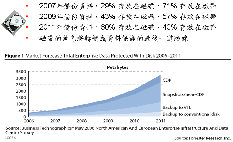營運永續管理(BCM:Business Continuity Management)是為了達成企業永續經營而發展出來的概念,在意外或是災 難發生的時候,如何在短的時間內恢復企業的營運能力。BCM可區分為兩種概念:一種是虛擬化(Virtualization), 另ㄧ種則是災難備援。災難備援包含:網路容錯備援(Fail-Over)、叢集(Cluster)、資料複製(Data Replication)。 虛擬化則針對伺服器主機虛擬化(Server Virtualization)、網路虛擬化(Network Virtualization)、儲存虛擬化(Storage Virtualization),其中儲存虛擬化市場是未來重要的發展,尤其是採用高階容錯儲存設備搭配虛擬化軟體以降低營運 風險是ㄧ個具成本效益的抉擇。磁碟儲存會成為未來的備份主流: